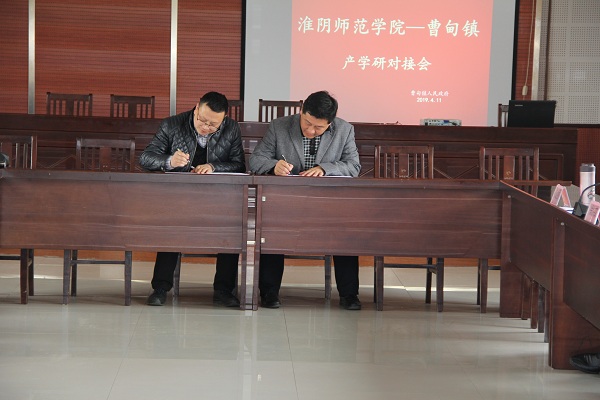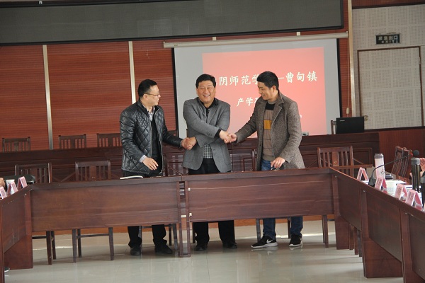 许建峰、强凤彬和楚剑分别代表淮阴师范学院、宝应县曹甸镇政府及扬州市楚楚文体玩具有限公司签订了“淮阴师范学院-曹甸协同创新中心”共建协议。